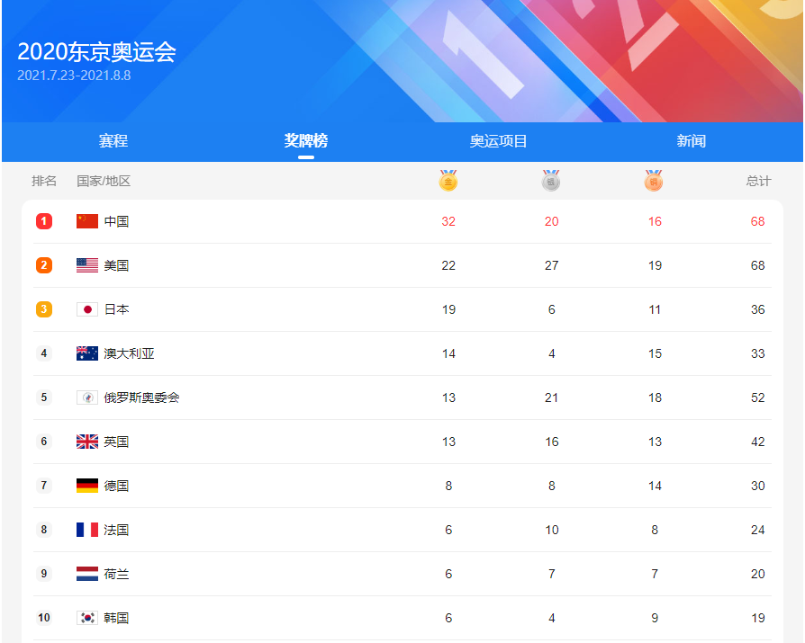 东京奥运会依旧在如期进行,中国以32枚金牌强势地站到了世界第一的位置,而作为东道主的日本,由于不敌美国滑落到了第三。
